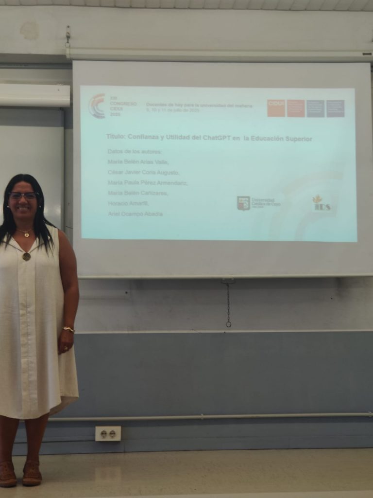 La Dra. Arias tuvo dos exposiciones, la primera referida a “Confianza y utilidad de ChatGPT en la educación superior” cuyos autores son el Dr. Frederic Marimon (Director del Observatorio de IA, UIC, España), María Belén Arias Valle (UCCuyo, Argentina), César Javier Coria (UCCuyo, Argentina) y Claudio Marcelo Larrea (UCCuyo, Argentina).